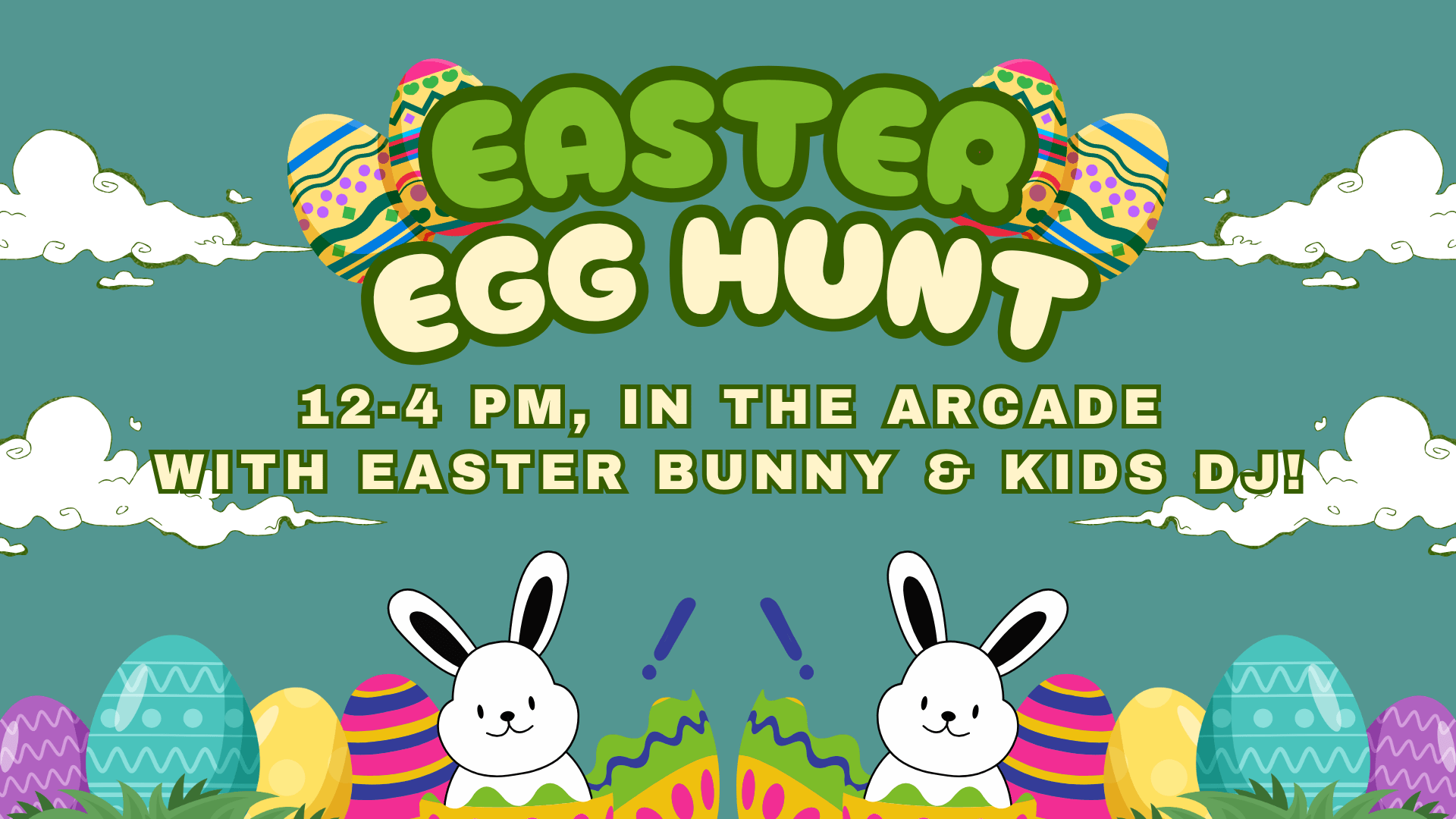 Join us on Easter for a Kids Easter Egg Hunt in the arcade, featuring a kids DJ & Easter Bunny! April 5th 12-4 pm!